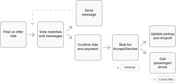 為此,我參考了其他一些協(xié)同消費(fèi) (Collaborative Consumption)類型的應(yīng)用產(chǎn)品,例如Airbnb 和Yardsale 等等。在嘗試了多種流程及界面布局方式之后,我們決定采用一種輕量級的確認(rèn)序列機(jī)制,它的操作界面類似于大家所熟悉的短消息界面。無論駕車者還是搭乘者都可以發(fā)起確認(rèn);例如,旅程結(jié)束后,一旦搭乘者完成了支付,駕車者收到款項(xiàng),此次拼車活動(dòng)就會(huì)被確認(rèn)完成。