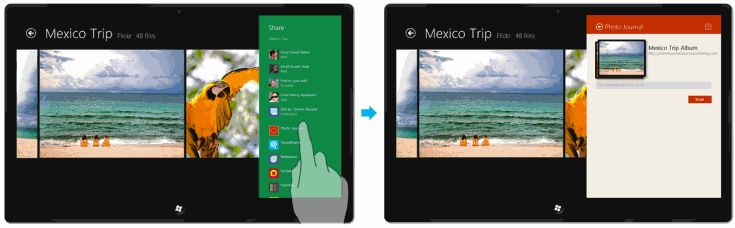 我們還可以進一步利用Metro應用獨特的功能特性,讓不同的應用訪問和使用彼此所包含的文件,例如在其他應用中使用相片日志應用里的圖片。通過這樣的功能,用戶無需首先在相片應用中將圖片下載到本地,然后再上傳到另外的應用中;系統(tǒng)會將所有支持文件選擇器契約的應用都看作是一個可以在任何地方讀取的文件存儲位置。