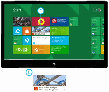 而Windows 8中的瓦片則整合了通知中心與數字標識這兩個方面的提示功能,用戶即可以直接在瓦片中閱讀提示信息,也可以點擊進入應用。另外,與iOS通知中心統(tǒng)一化的輸出格式有所不同,Metro風格的應用瓦片允許設計師從大量模板當中選擇不同的樣式。