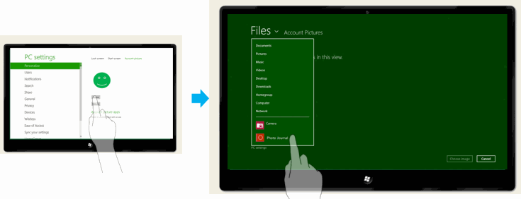 如上圖所示,用戶在PC Settings界面中點擊“瀏覽”,以更換頭像圖片。由于我們的相片日志應用支持文件選擇器契約,所以在接下來的文件選擇界面中,就會看到應用名稱出現(xiàn)在列表當中,用戶可以選擇該應用當中存儲的相片作為新的頭像。
