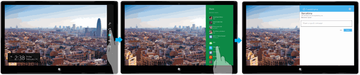 而在Metro風格的應用當中,我們會使用分享契約 。這種技術方案簡化了設計與開發(fā)方面的工作,因為我們不需要為用戶有可能用到的社會化服務而將它們與每個單獨的應用都逐一整合起來。不僅是社會化服務,用戶還可以將信息保存共享至平臺上所有那些使用了分享契約的應用,而開發(fā)者們則無需擔心外部服務的接口問題。站在用戶的角度,他們可以在charms bar這個固定的地方完成有關分享的操作。