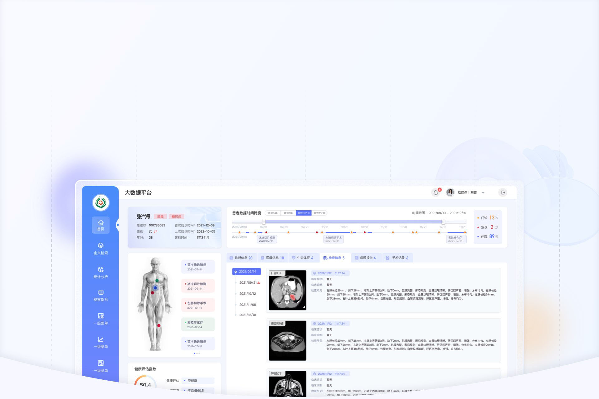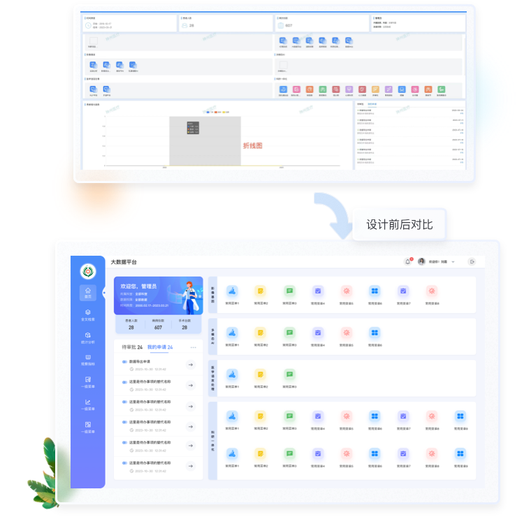 核心數(shù)據(jù)突出顯示-原來(lái)首頁(yè)沒(méi)有登錄人員信息,并且 [患者人數(shù)]、T病例份數(shù)]、手術(shù)臺(tái)數(shù),等數(shù)據(jù)每個(gè)占據(jù)一個(gè)大框顯示頁(yè)面顯得空洞,通過(guò)整合增加登錄人員信息以及歡迎語(yǔ),使整個(gè)頁(yè)面更有親和力,一些相關(guān)數(shù)據(jù)采用卡片疊加的形式展示,不能可以增加整個(gè)頁(yè)面的靈動(dòng)感,并且把登錄人員的相關(guān)信息緊密關(guān)聯(lián)起來(lái)